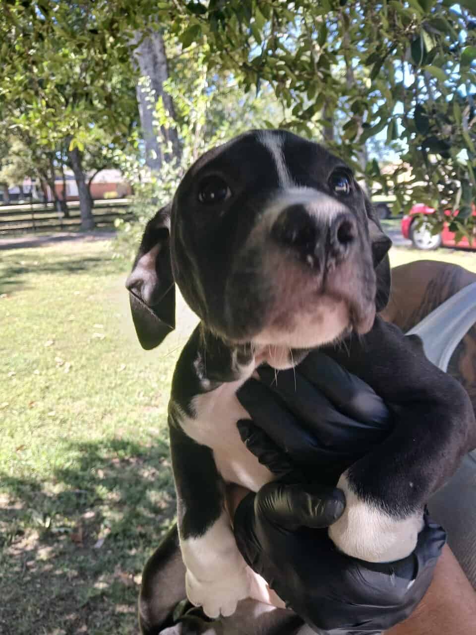 Meet Athena, an adorable black and white puppy with striking eyes that sparkle with curiosity and innocence. Her glossy black coat is accented by a crisp white blaze down her face, a snowy chest, and charming white socks on her paws, giving her a tuxedo-like elegance. Sitting calmly on the kitchen counter, she displays floppy ears, a pink-tipped nose, and a sturdy, compact build perfect for playful adventures. Athena's gentle expression promises endless cuddles, loyalty, and joy for her new family. This sweet girl is healthy, energetic, and ready to bring love into your home.