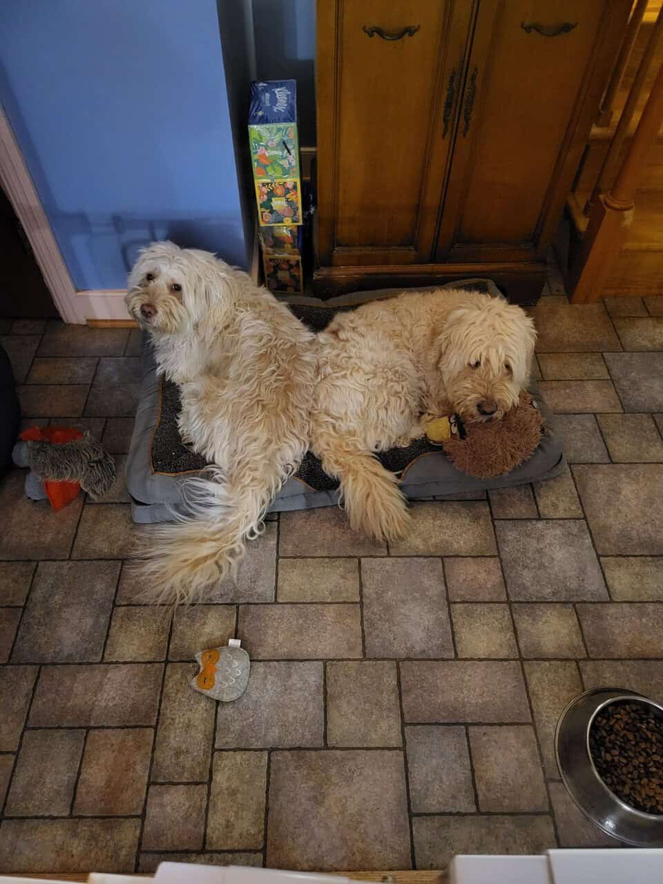 8 years this November. Loving, gentle. Live with multiple cats but never been around other dogs or young children. Come with food, toys and crates. Crate trained. We are forced to relocate to another country and can't afford to take them. Leaving in 3 weeks. Retriever/Shitzhu mixes. Very good at entertaining each other. Indoor dogs. Both in excellent health and all shots up to date. Eat Iams lamb and rice.