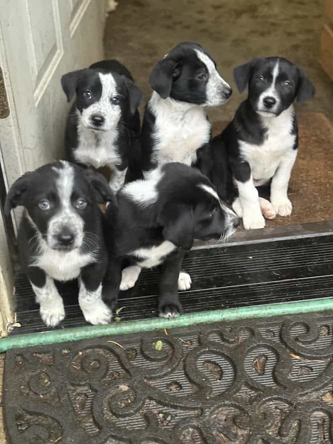 9 week old puppies ready for new homes! Already vaccinated. Father is a purebred Border Collie working rodeo dog, and mother is a Border Collie/Vizsla cross & amazing trail running partner. These puppies are playful, smart, agile, and lovable.
