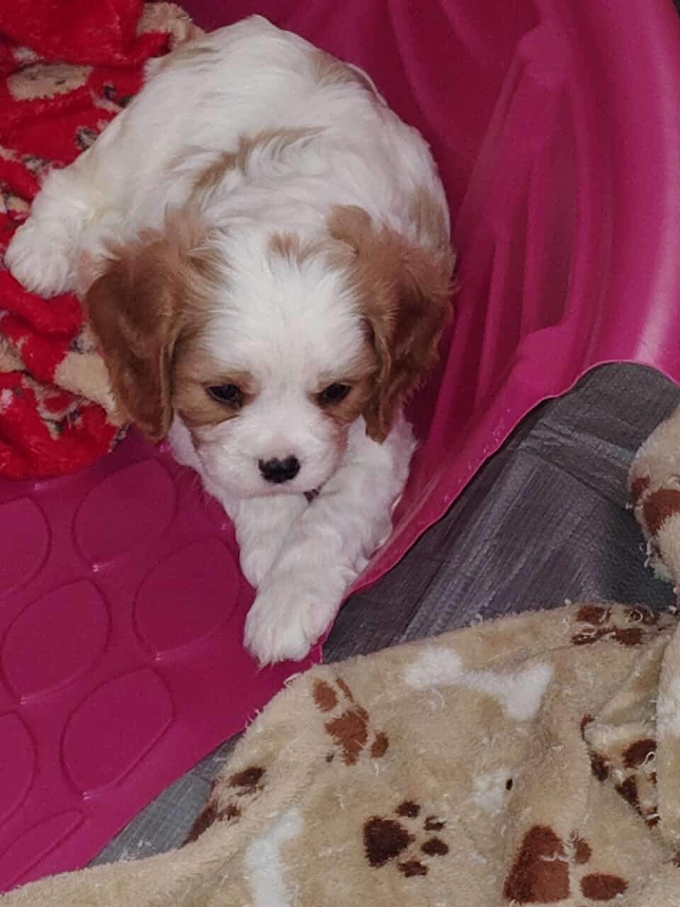 We have a beautiful litter of pups. The 3 Blenheim boys are available now and the boys are $1000 each. The girls have sold. Raised in our home and socialized. They will be wormed and have their 5 way puppy shot. We are looking for loving families for all of them. Please visit soon to choose your new family member!! They are ready on September 6-7th at 9 weeks old for their new family homes. We have lots of videos of them!!