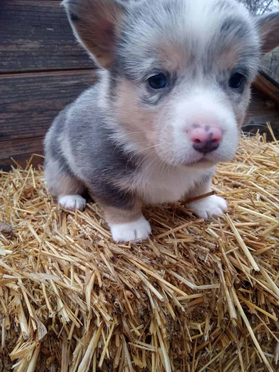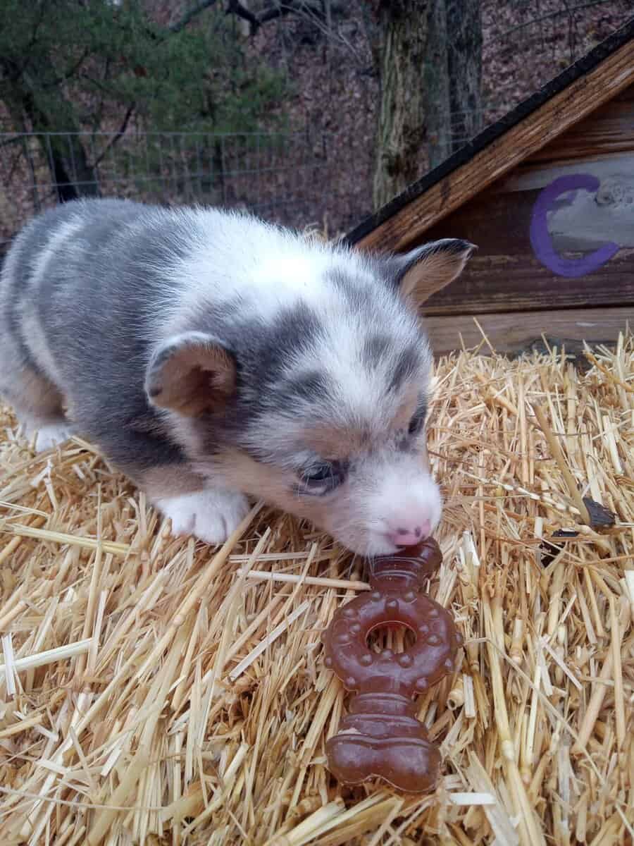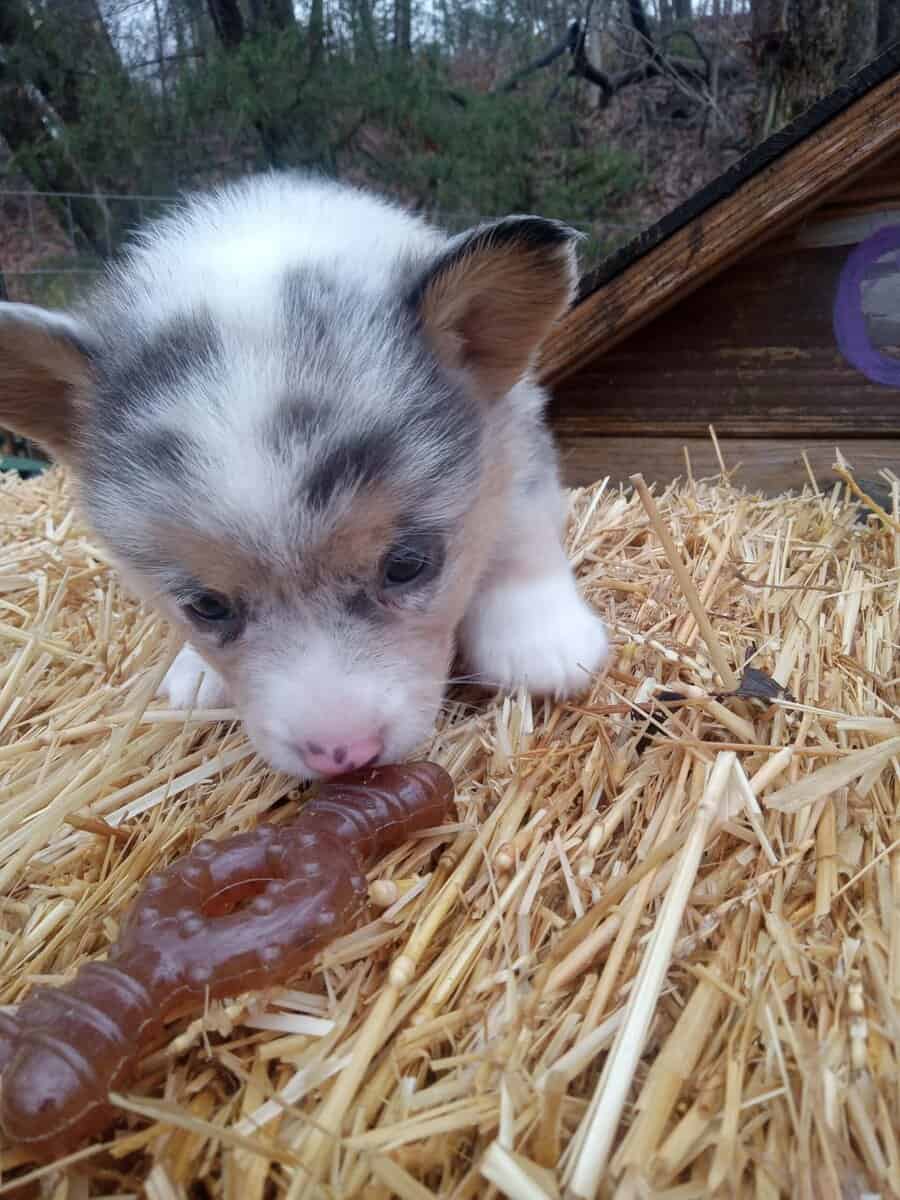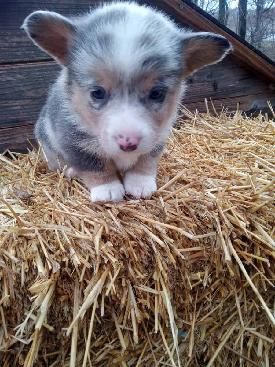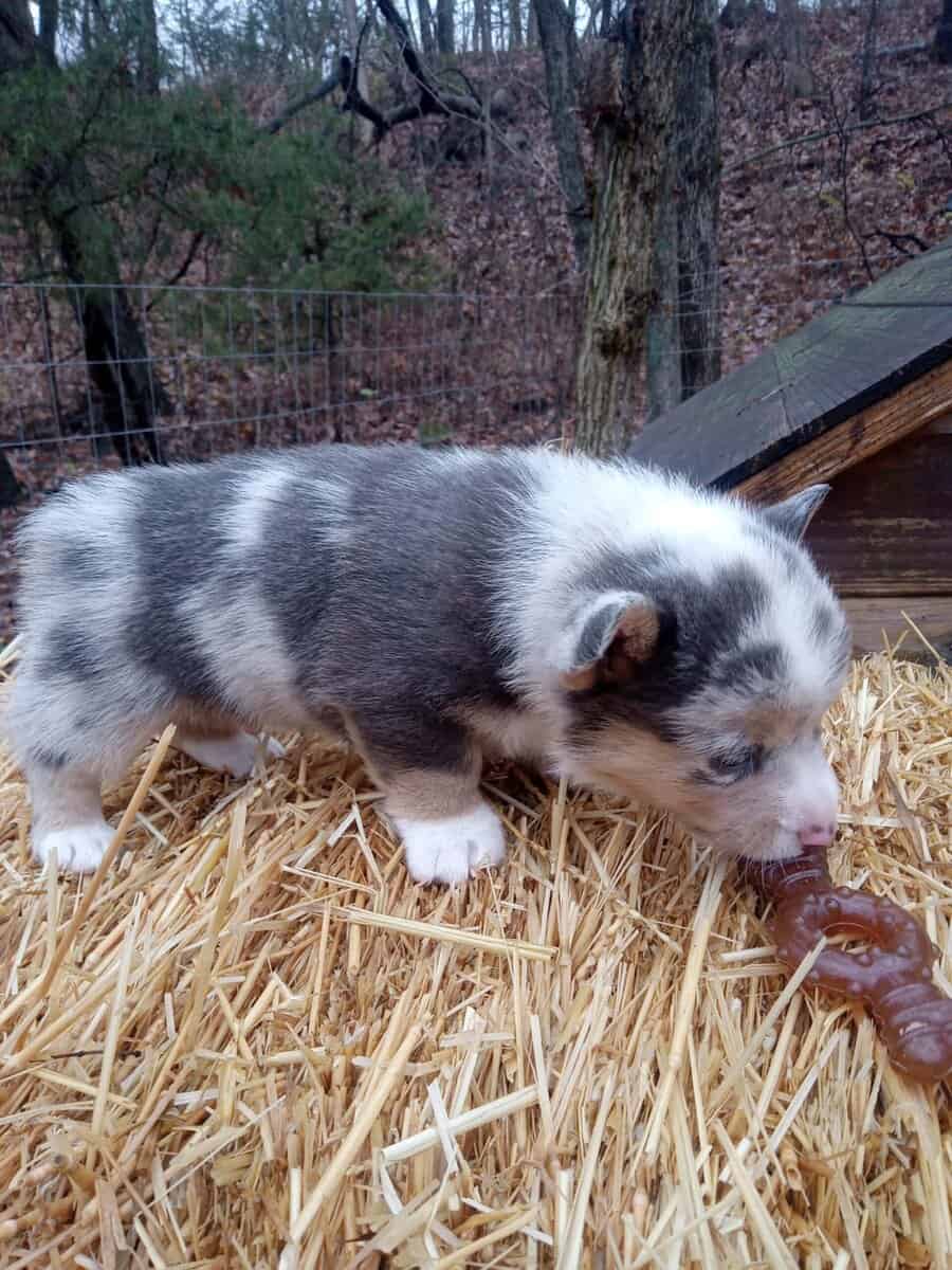 Chunky Monkey is 6 weeks old and will be ready to take home right before Christmas! Got his name for being the chunkiest in Chloe's litter (you can see Mama Chloe on our website). He's growing like a weed and loves chewing on sticks and roughhousing his brothers and sisters. Very pretty merle coat pattern with lots of tan patches. AKC dam and CKC sire, both genetically tested. He will come with a full veterinarian health check and vaccinations. Northeastern Kansas. More info at www.cordwoodcorgis.com