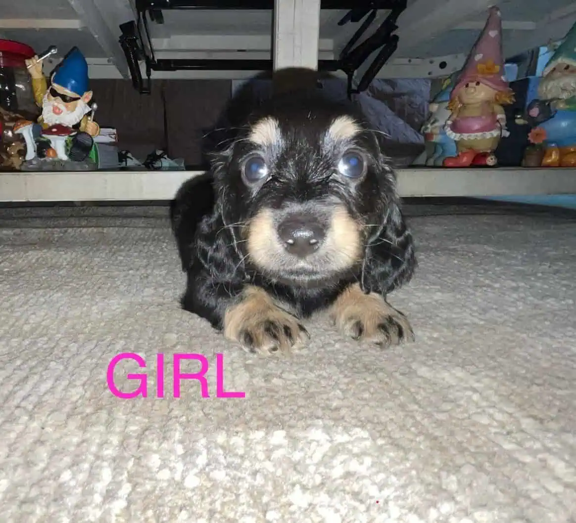 I have a total of 5 puppies to sell. These are long - haired dachshunds. For some reason I could not get all the pictures to come over. I have , 2 of the pie bald puppies they are both boys. I have 2 black girls and 1 black boy. The mother is a pie bald long haired black and white, the father is a long haired red. These puppies were born on June 18th, 2025. They are eating regular puppy food and have had their first shots