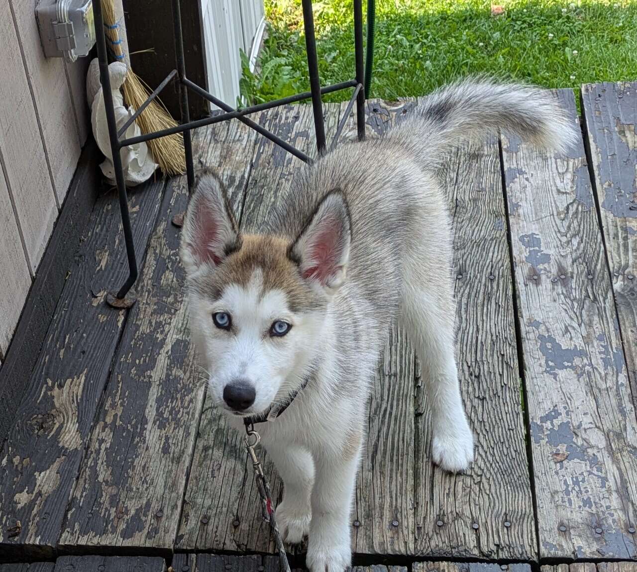 Beautiful 4 months old AKC Siberian Husky female puppy. Good with kids and animals. Family moving to new rental house with no pet policy. Doing very well with potty training.