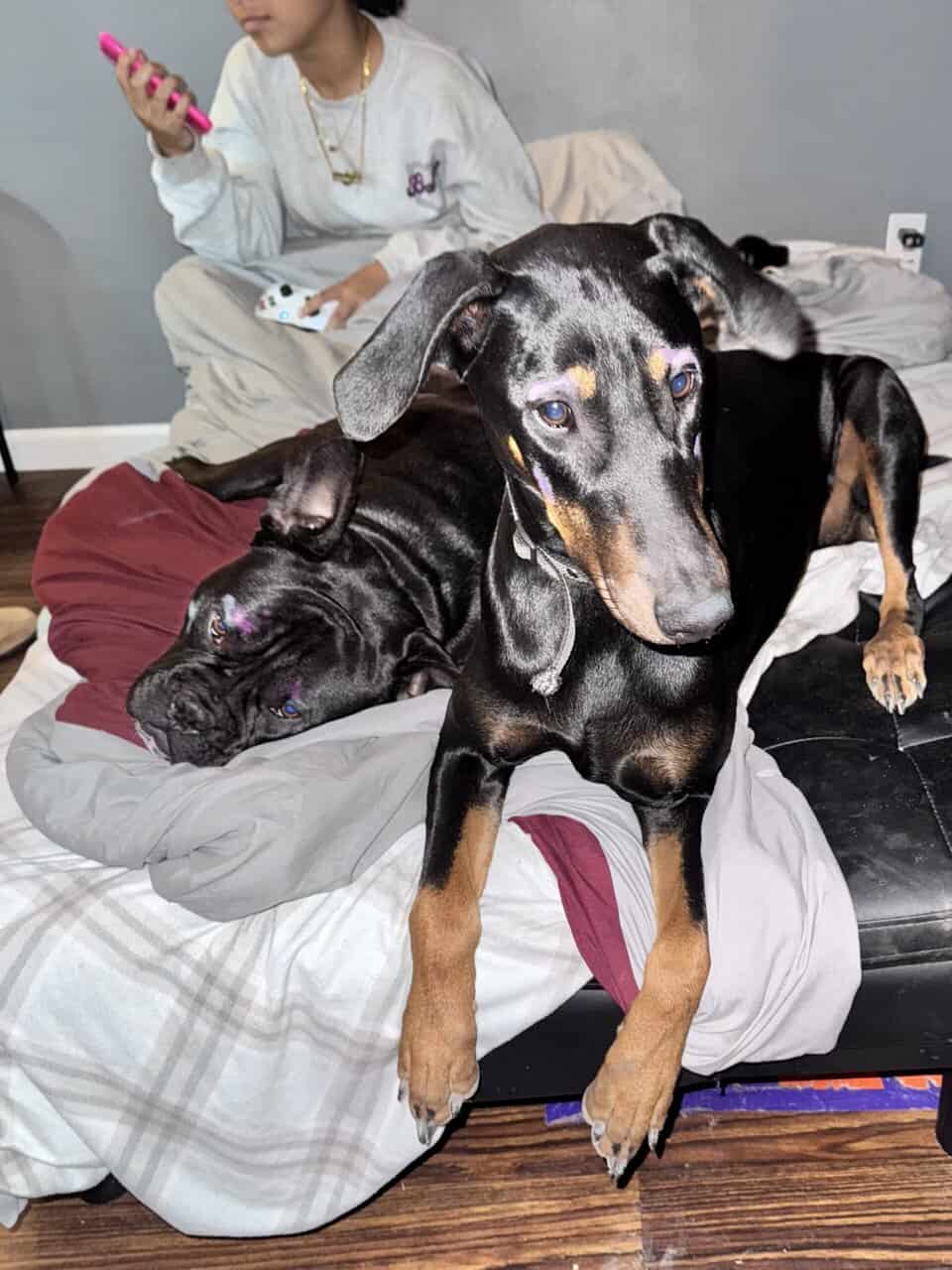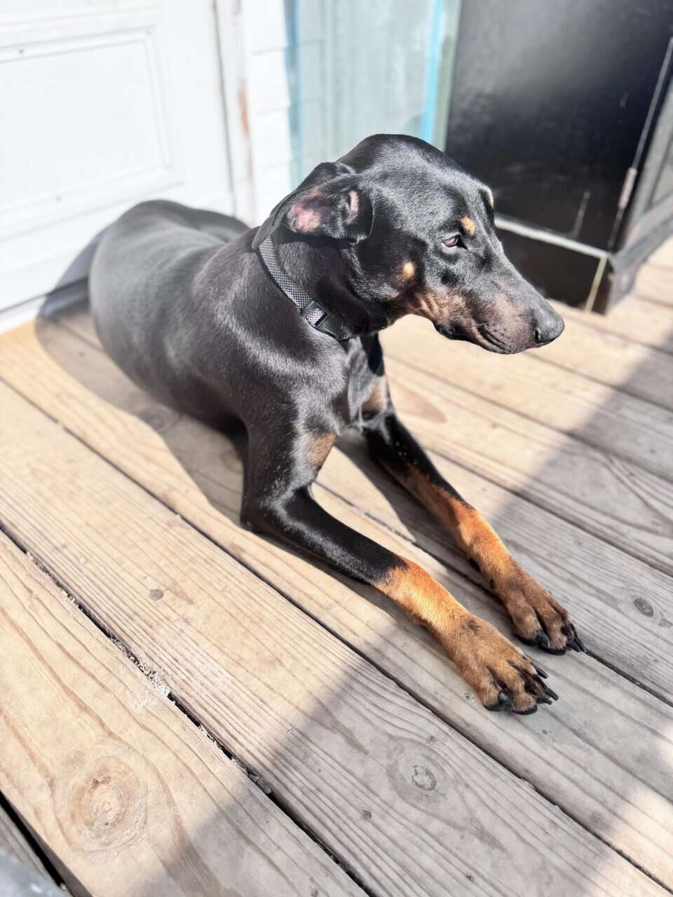 Ruby is a female Doberman , she is 1 years old full of energy . Shes used to being around our dog, we haven’t introduced her to any others but I’m sure she’d adjust just fine . She’s loving but needs to be trained . She is kennel trained and knows the basics as in sit , wait . She’s roughly 50 lbs up to date on shots & chipped but not fixed .
