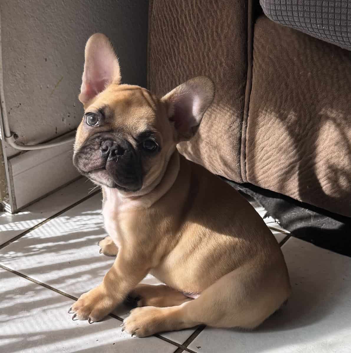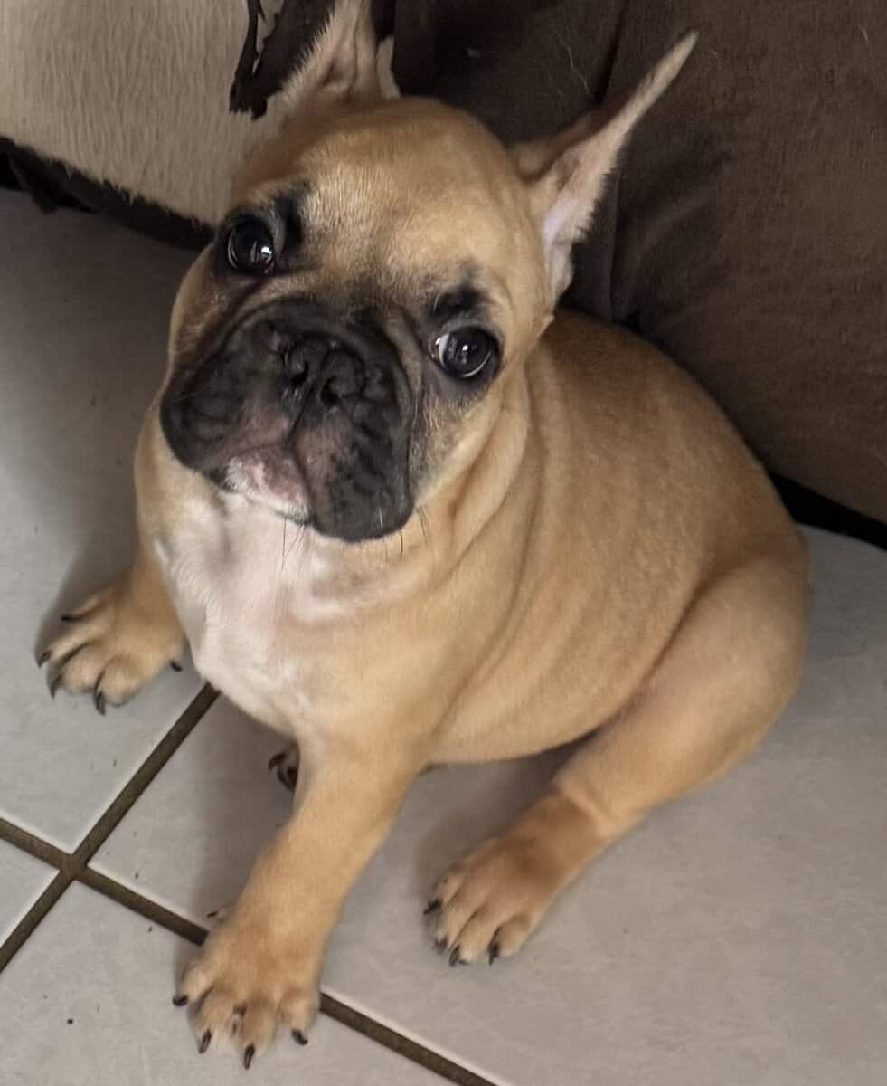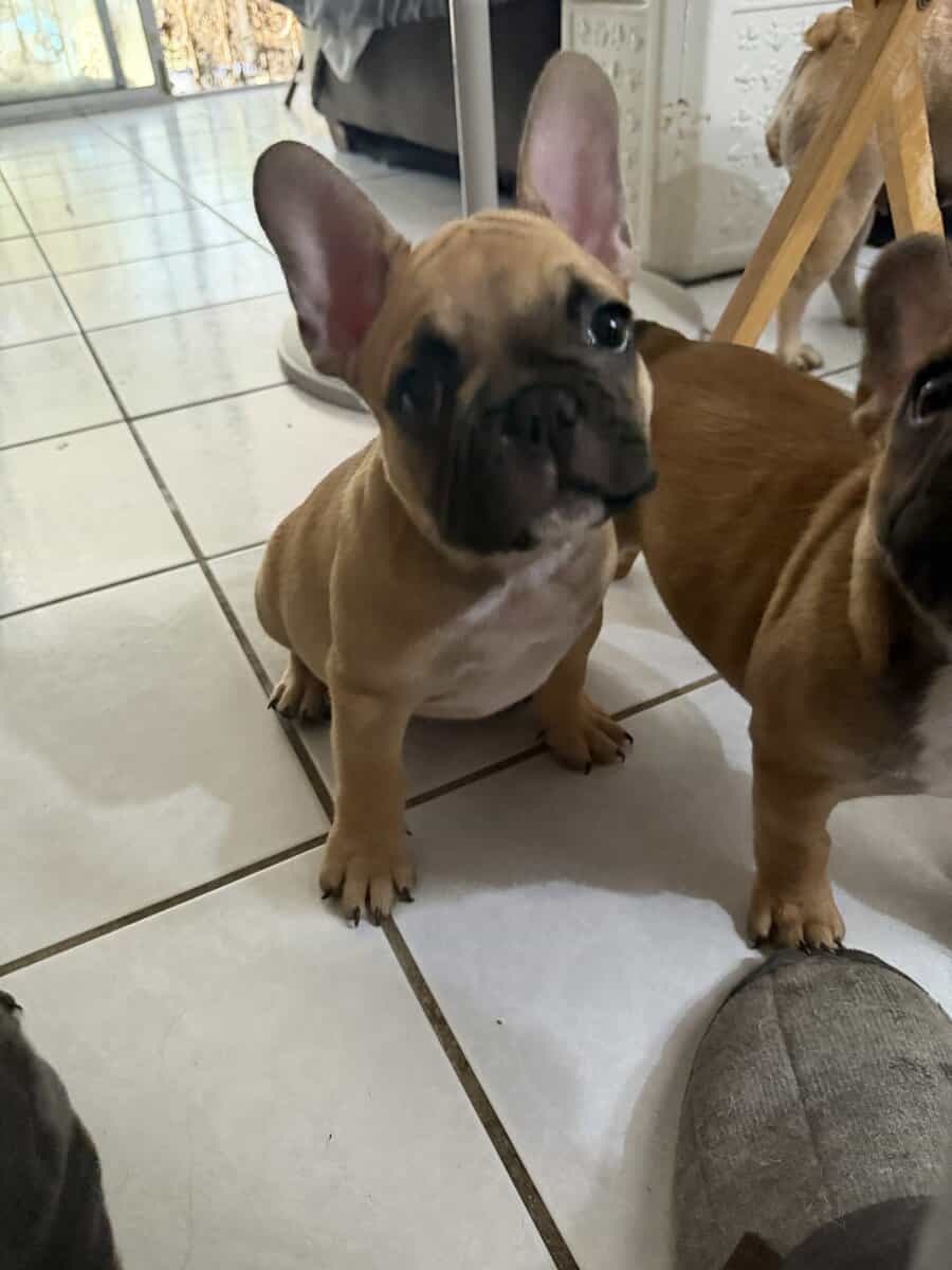 Playful 12 week male frenchie. Up to date on vaccines. Good with kids and loves cuddles.