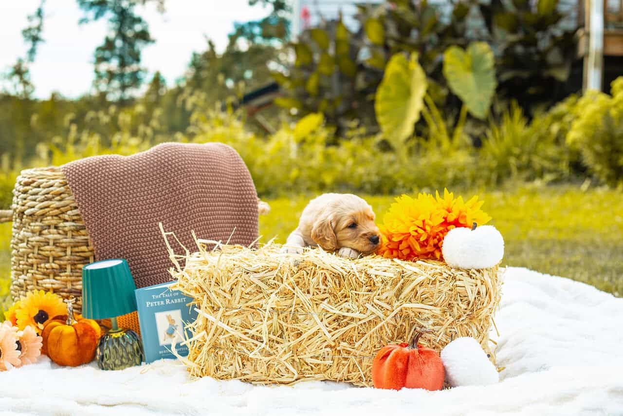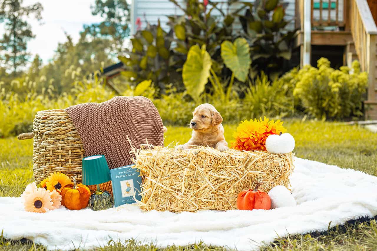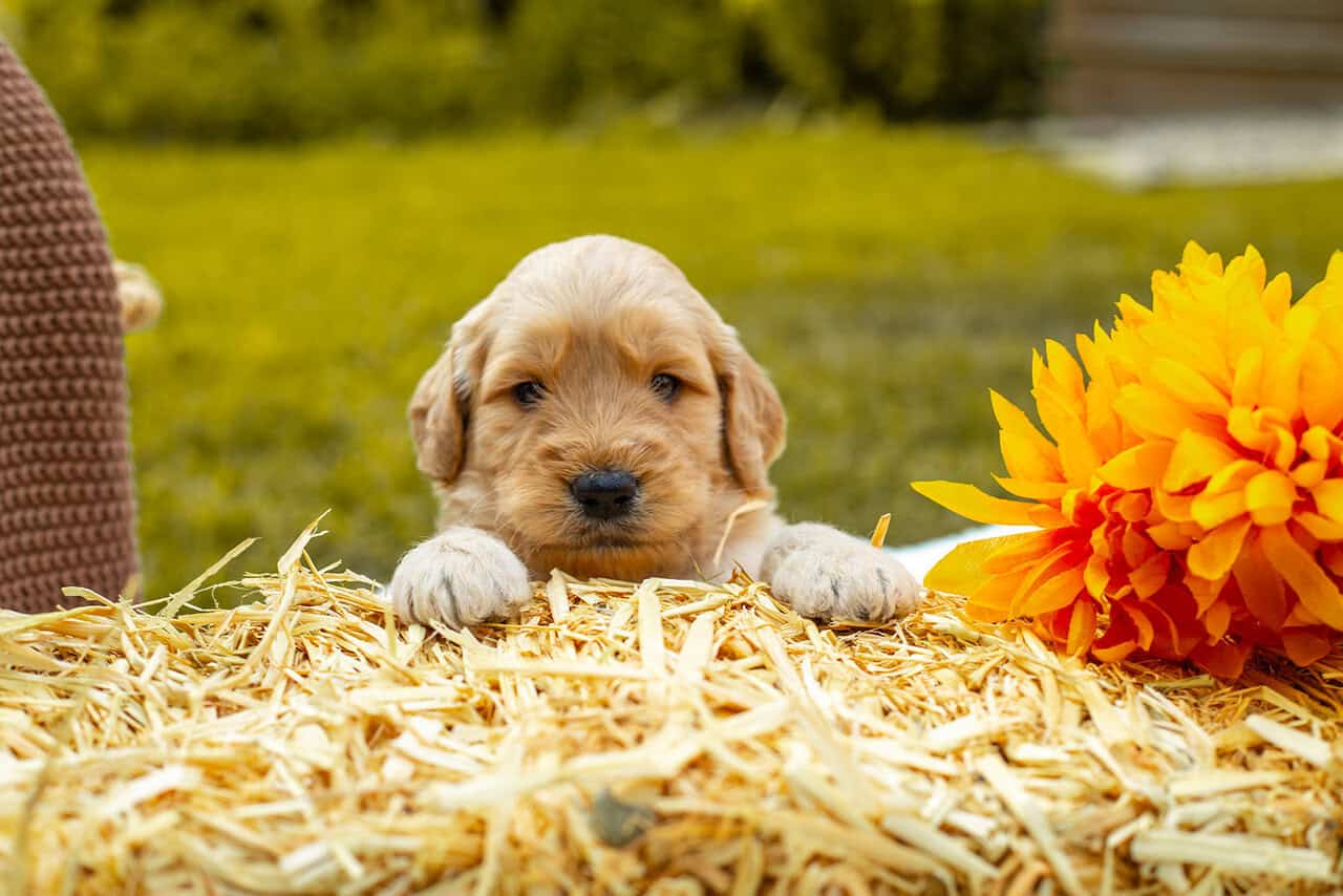 Family raised goldendoodle in the heart of Virginia. Dad is an f1b goldendoodle, mom is an AKC registerable golden retriever. Baby doggie is a Better Back Goldendoodle, or an f1b backcross resulting in hybrid vigor. Mom and dad are both family pets on site. Both mom and dad topped out at 60lbs. These puppies are hand raised by homeschool family. Desensitized to outdoor and indoor noises. Toddler socialized. Very social and friendly pups.