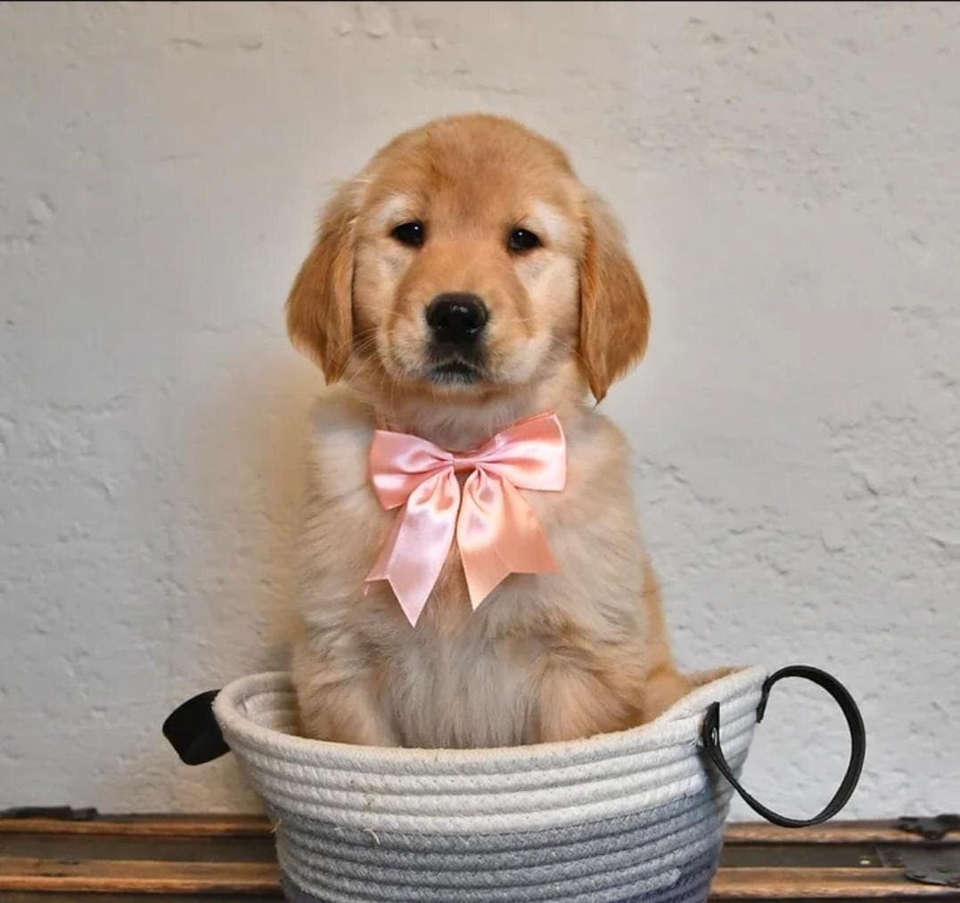 Meet Paige, our handsome and cuddly Golden Retriever puppy! With her soulful puppy eyes and smiling face, she is sure to steal your heart! This lovable fluffy teddy bear will be a delightful playmate to romp with you in the colorful leaves and autumn sunshine. Paige is a bundle of energy and affection, always looking for the next adventure. She has a charming personality, is well socialized, and loves to play and spend time with people! Golden Retrievers are the perfect mix of fluff, energy, and sweetness. With their soft golden coats and big, curious eyes full of mischief, theyre instantly lovable. Golden Retrievers are always ready to chase a toy, explore a new corner, or curl up with you for a nap. Known for their gentle nature and eagerness to please, they quickly become more than just a pet. Paige comes with an UKC litter certificate pedigree, a six month genetic health guarantee, a small bag of food, and a cute bow collar. She is current on vaccinations and dewormer and has been vet-checked. Paiges mother, Magnolia, is a friendly, calm lady who loves to be with people and absolutely adores belly rubs! Her father, Bruno, is a charming gentleman who is always ready to play and loves to swim or play fetch. Paige is like her amazing parents and will be a joyful, loyal companion to her family.