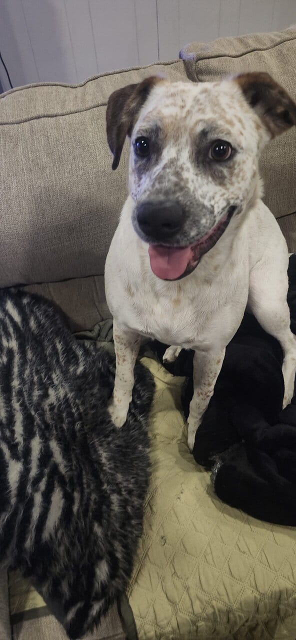 Helena is a cuddle bug who thrives on love and attention. She’s already 95% housebroken, loves car rides, and adores spending time with her cat siblings. She’s incredibly smart and eager to please—she even taught herself to shake simply by watching her siblings learn new tricks.