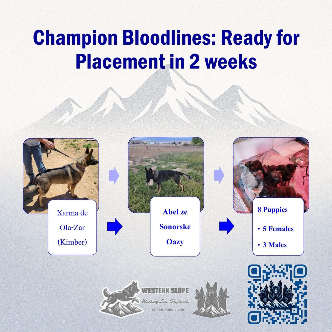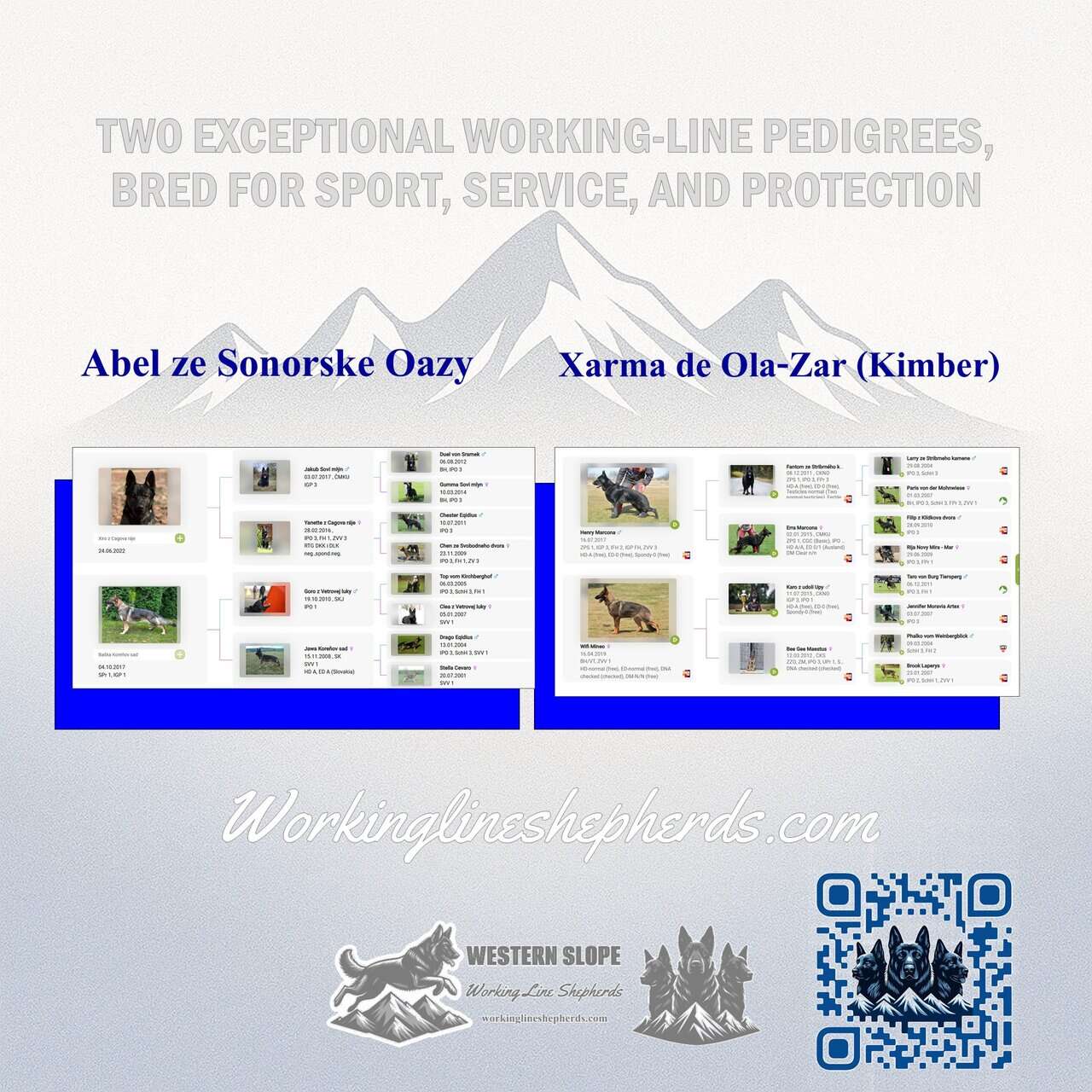 Abel’s grandsire, Jakub Soví mlýn, placed 6th at the Czech IGP3 Nationals and was a substitute for the FCI World Championship. Kimber’s maternal granddam, Karo z Udoli Upy (IPO3/SchH3/ZVV3), won the 2020 IGP Czech National and competed at the 2021 WUSV World Championship.