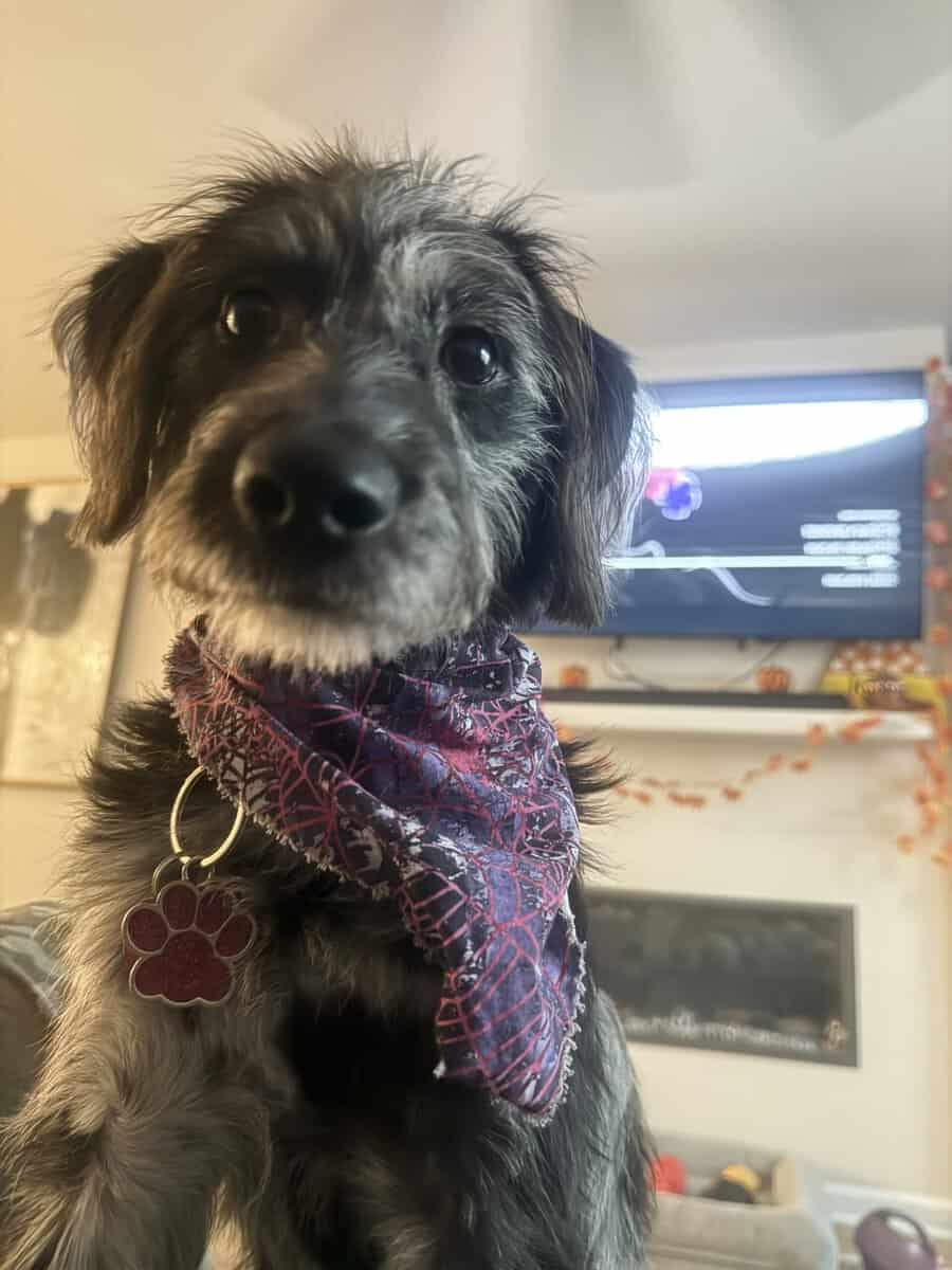 She is one years old her birthday is in March. She is a mixed breed dog poodle with labrador first generation. She has all of her shots and has been spayed.