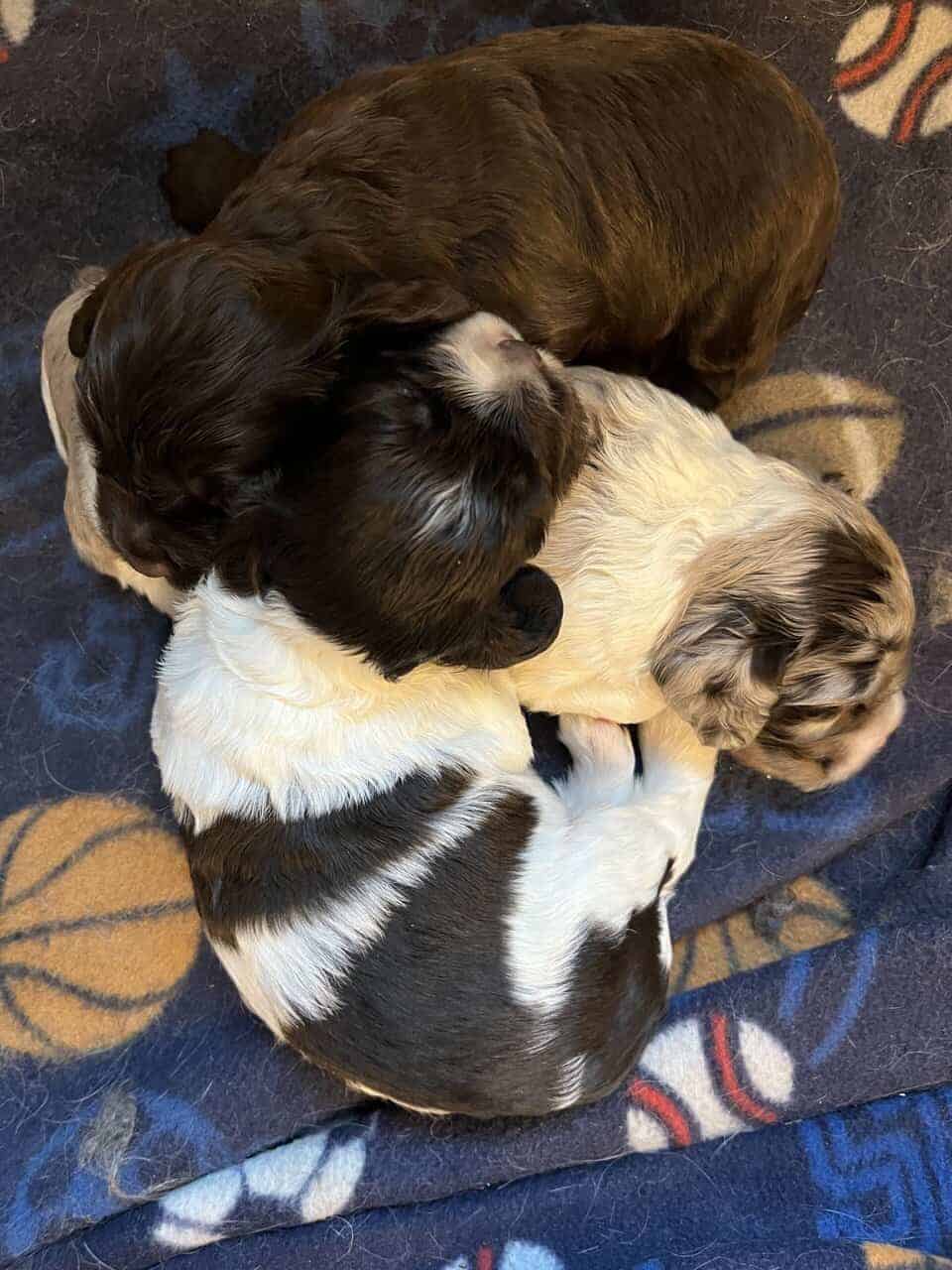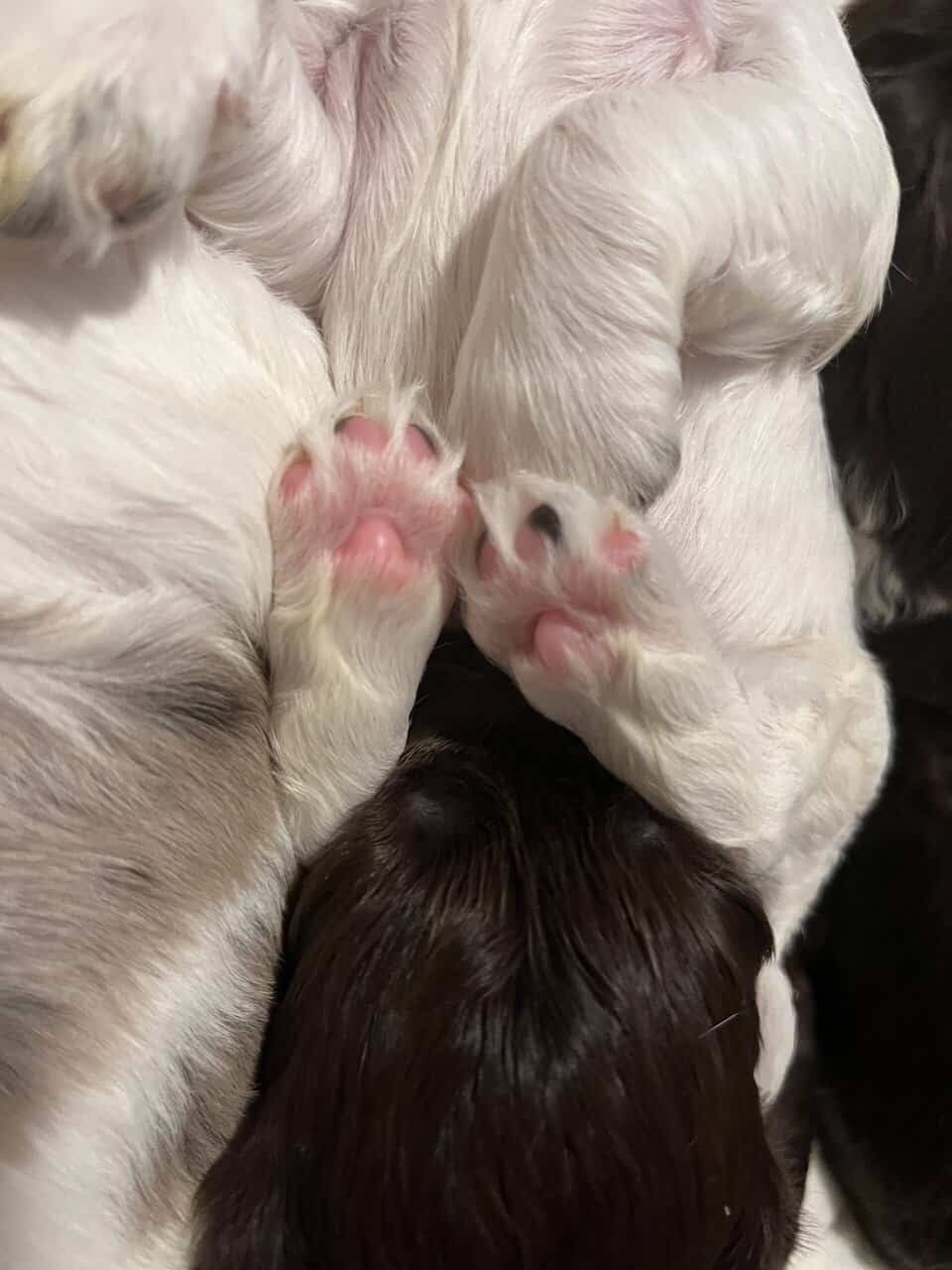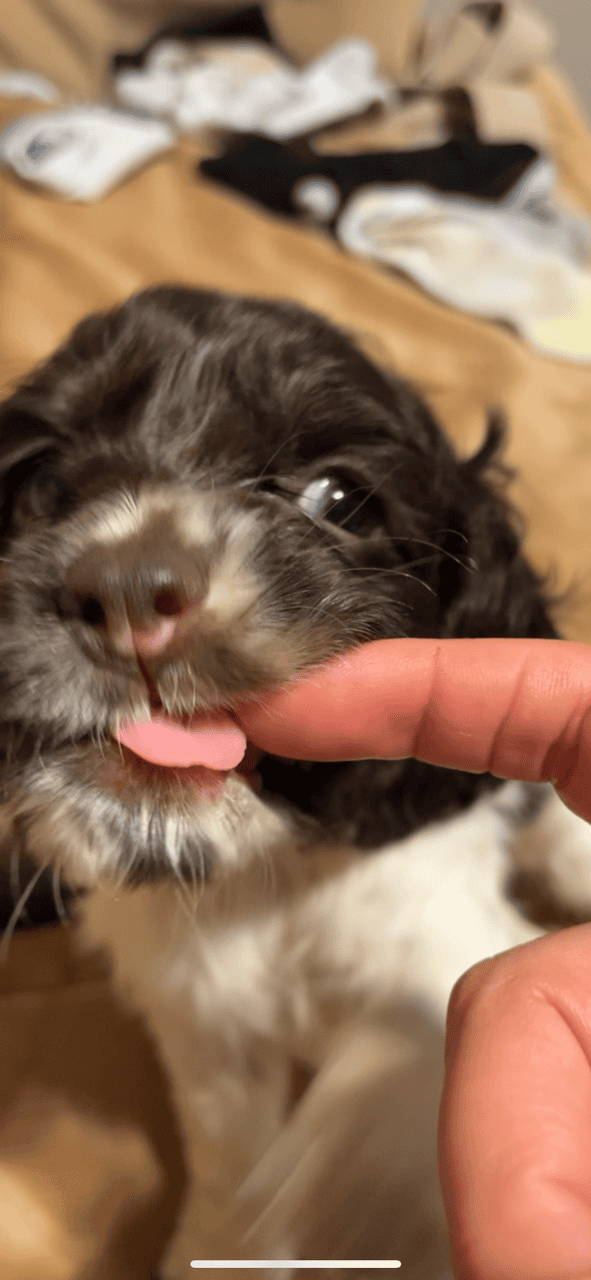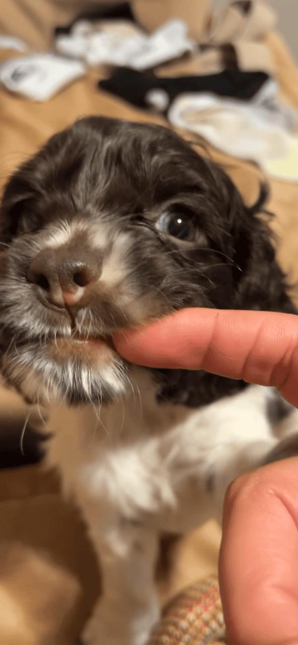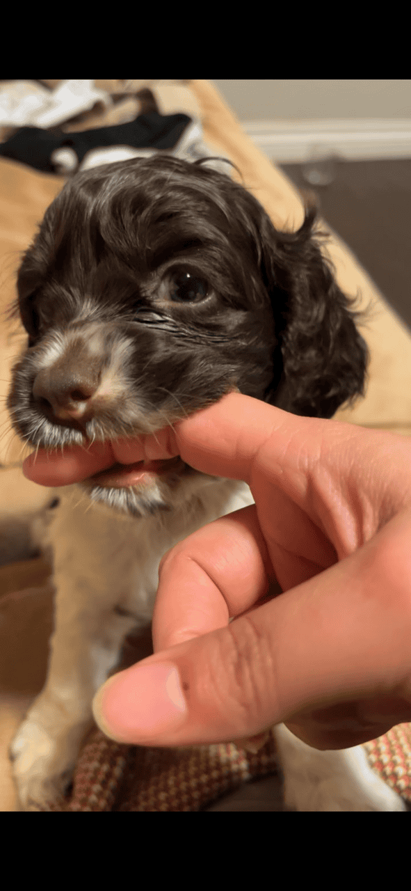 Hi, this is Cow! He is the sweetest little guy and very calm natured. He like his namesake looks like a baby cow with a white coat with black markings. He has a white freckled patch on his nose as well as freckles on his little paws. He is 10 weeks old and currently a little over 5lbs with 25lbs being average for an adult Cocker Spaniel as they are medium sized dogs. Both his parents are AKC registered pureblood Cocker Spaniels. He is up to date having received his first round of heart worm and parvo vaccine.