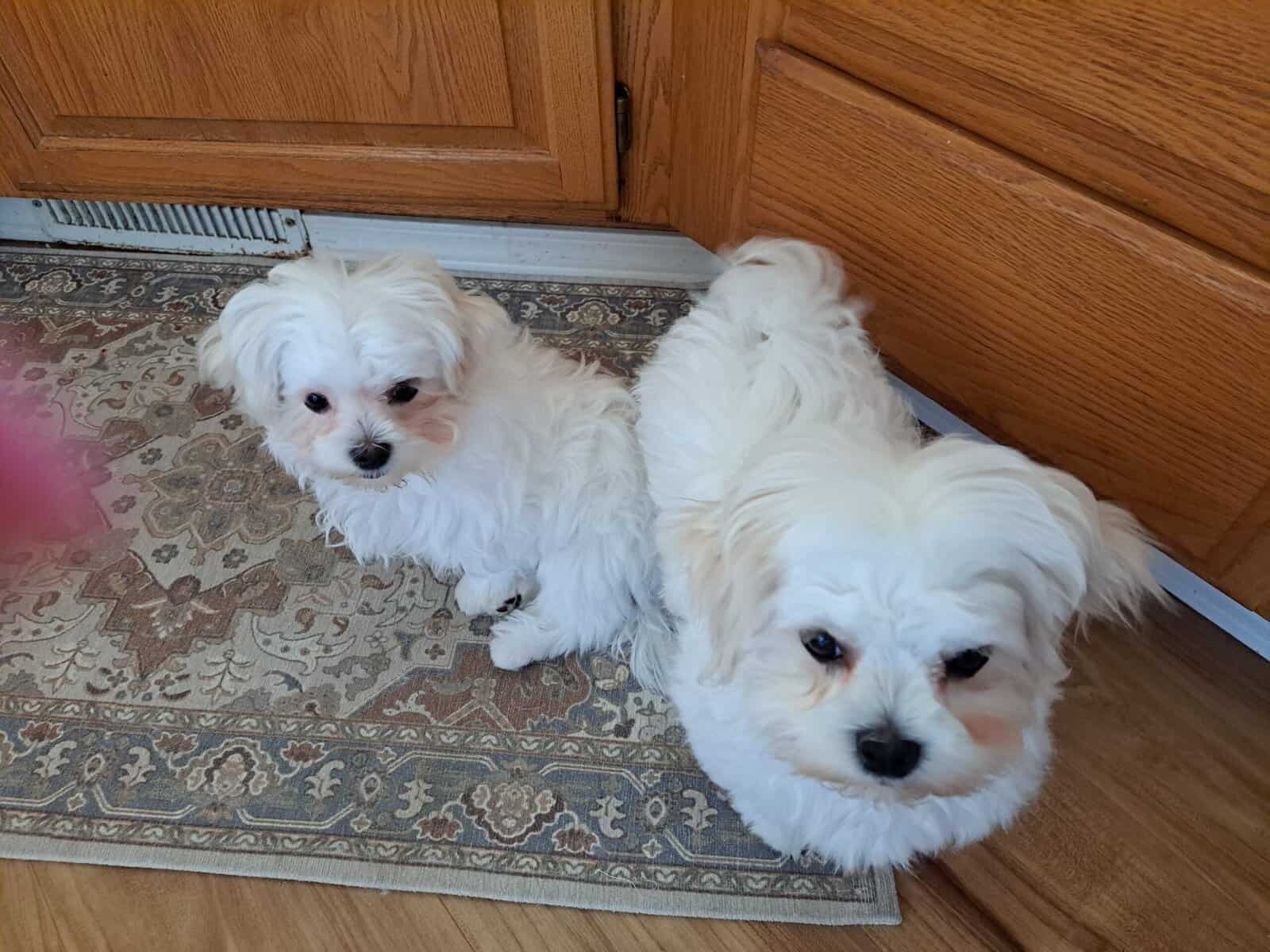 Can use doggy door when they remember. Eating dry dog food and enjoy treats! Like to run off with slippers!