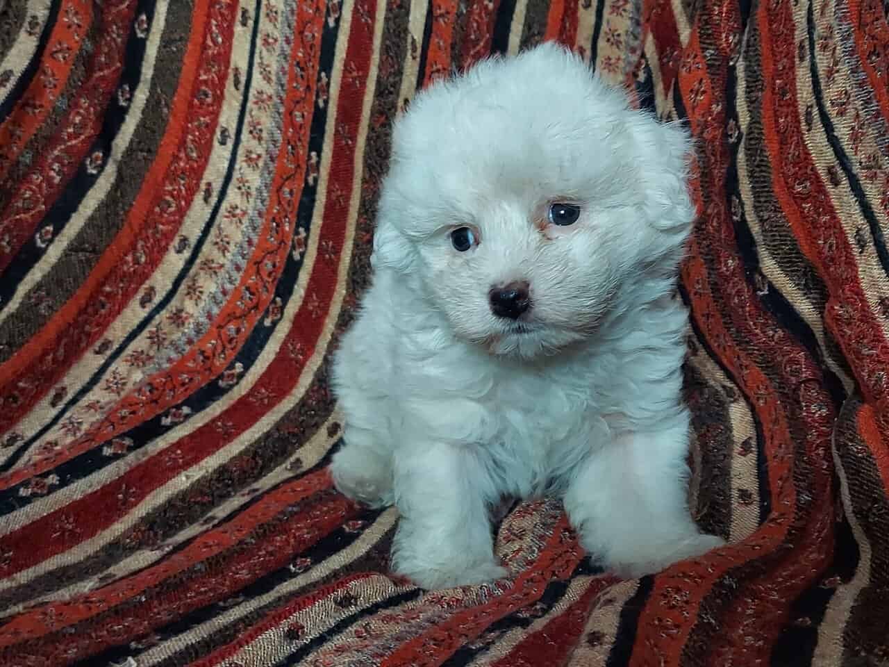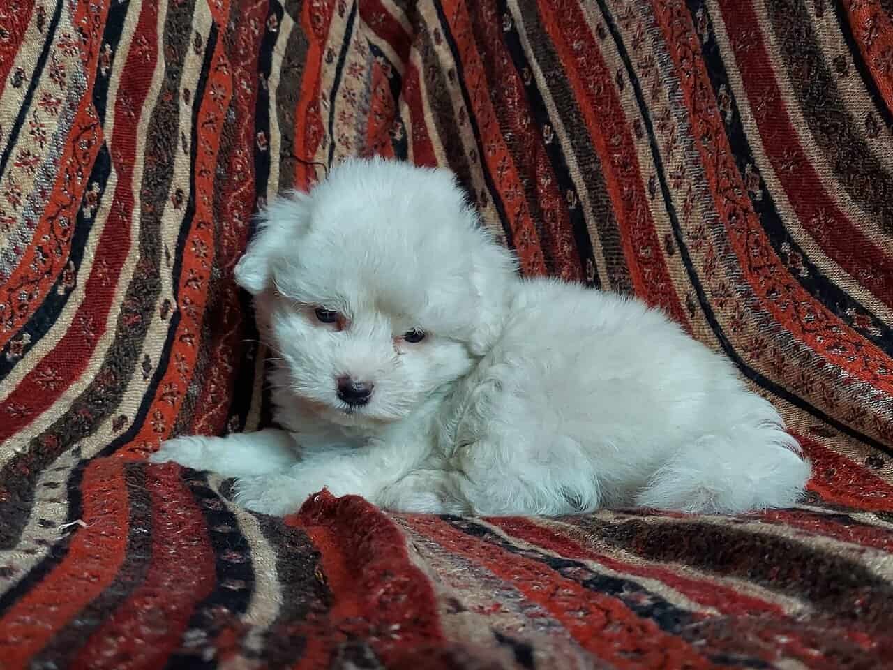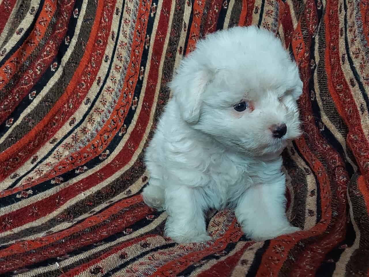 Apollo is a white MaltiPoo male. He was born on July 2, 2025 and will weigh about 7 lbs as an adult. He is a very sweet loving puppy who is happy to play and explore.  He is growing up around children and cats. . Apollo’s parents are Ash (MaltiPoo) and Koa (MaltiPoo). Fall Sale  $975  (was $1,175)