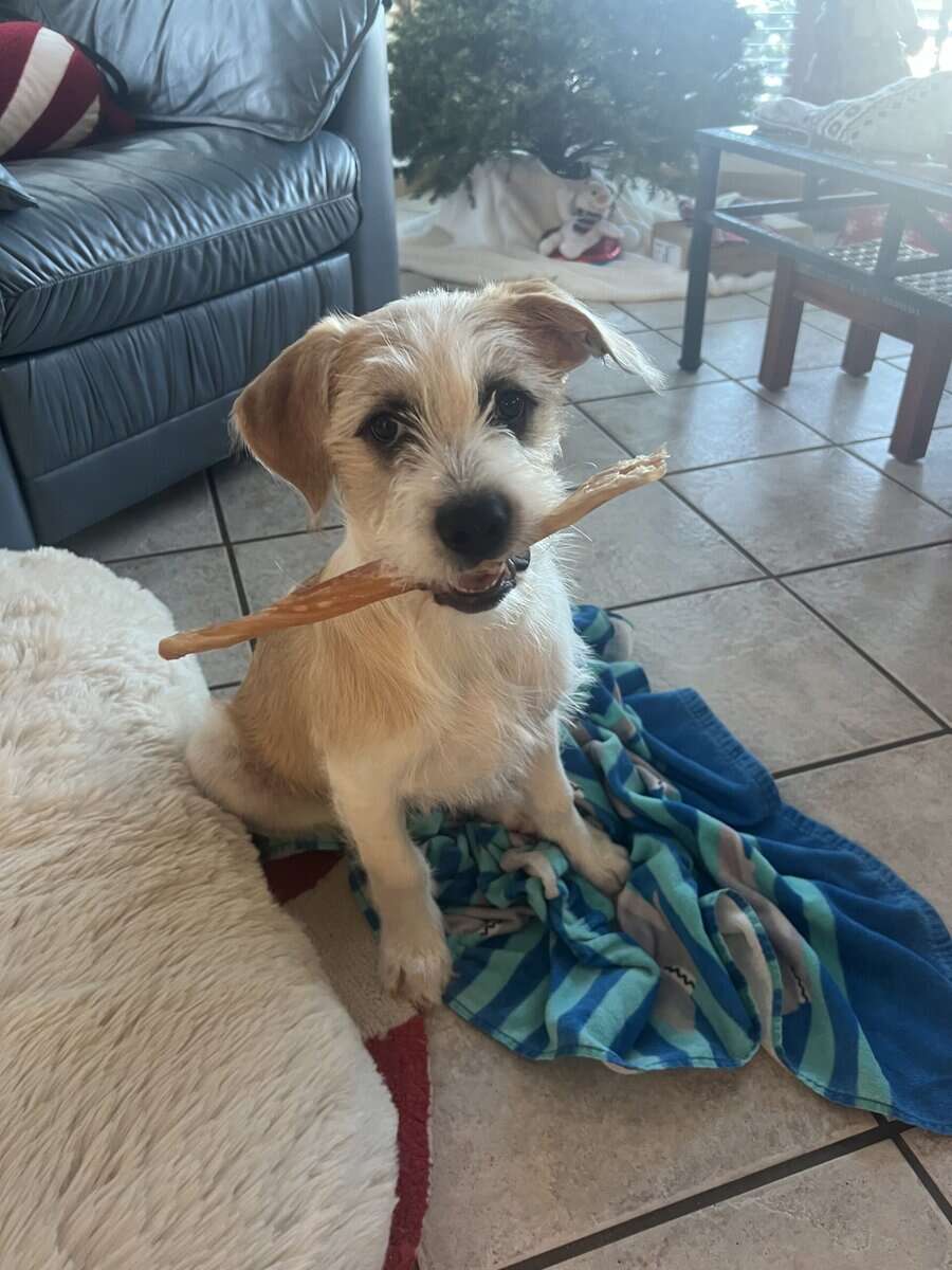 Like many puppies, Cowboy is currently in his mouthy/biting stage, which is normal at this age and continuing to improve with training and redirection.