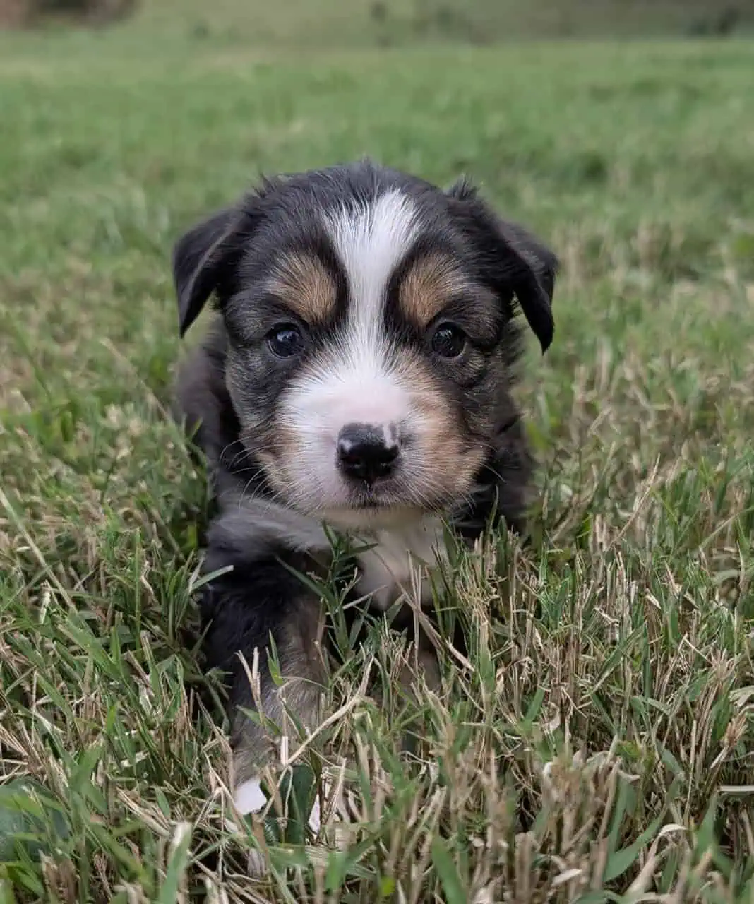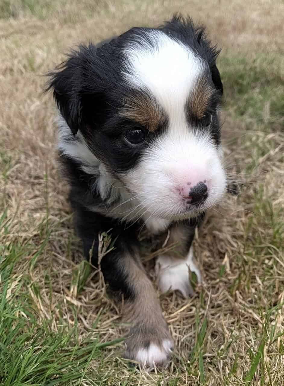 Four black tri miniature Australian shepherd puppies. 3 girls, 1 boy