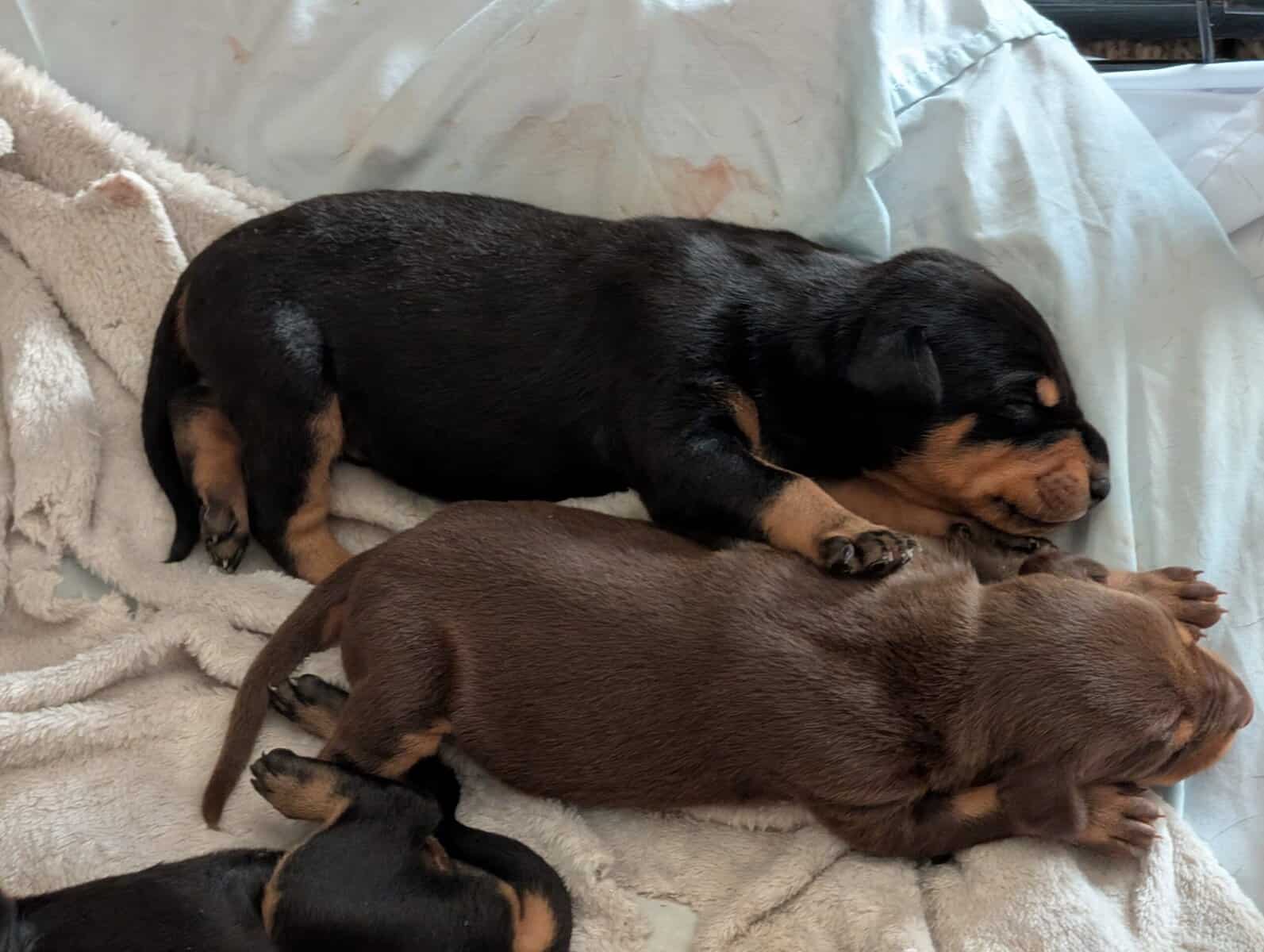 Full blood doberman puppies for sale. Their two weeks old and still nursing with mama. Males and females available for homes in early January. Each puppy comes with tail docked and initial vaccination as well as care instructions, if needed.