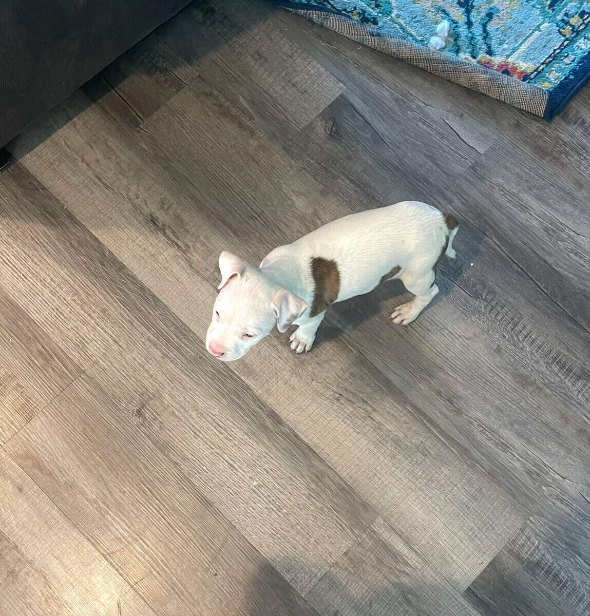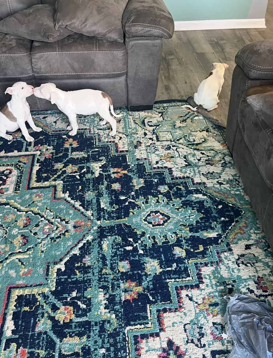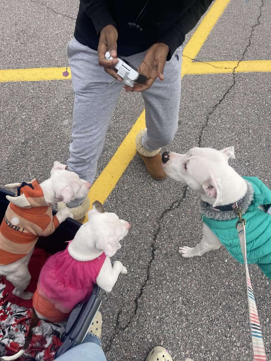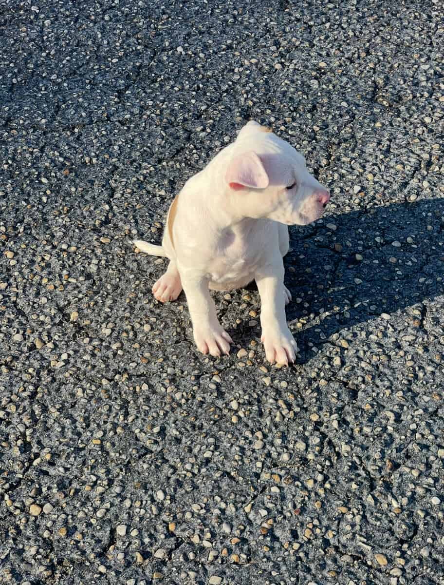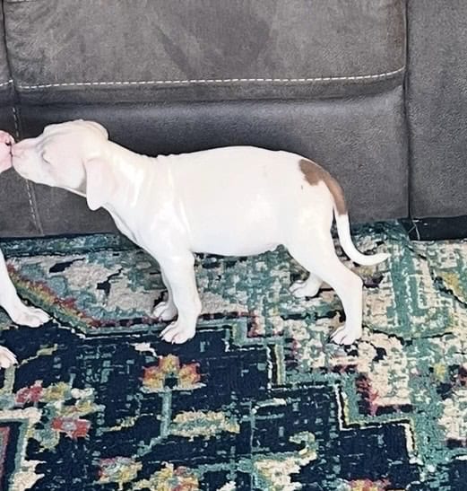 They’re pure bred and from the same parents as our older pup (she’s the big white dog in the pics) That’s how they’ll look when they get older except they’ll be all white with brown brindle spots.