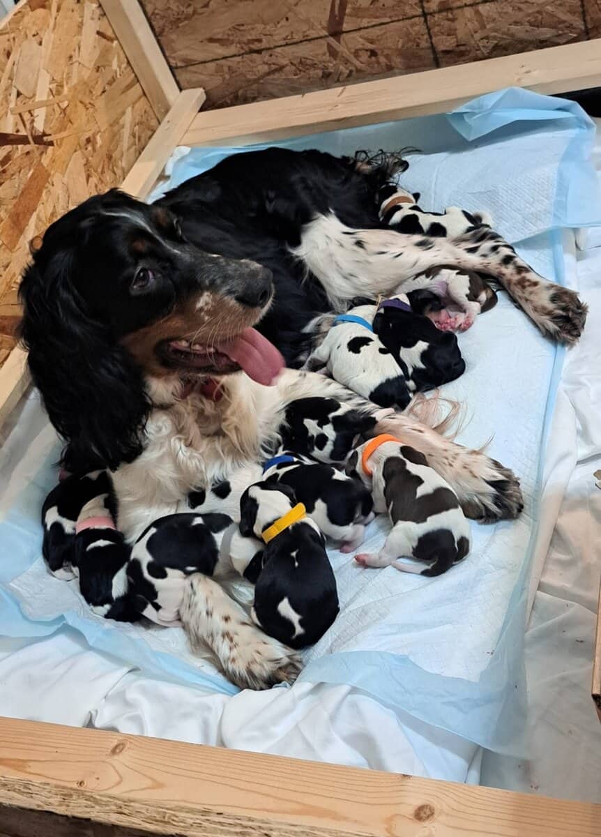 8 pure bred English Springer Spaniel puppies from great stock, well bred. These puppies have great temperaments, are very loving, in good health, love to be around people and are good with other animals too. They are energetic playful dogs that love to be around their people and will grow to around 42 - 52 lbs. with beautiful soft coats. They can be registered with the AKC if you choose. They come with a vet health check, breed registration paperwork, and a puppy starter bag. If you have any questions we're happy to answer them. Serious enquiries only please.