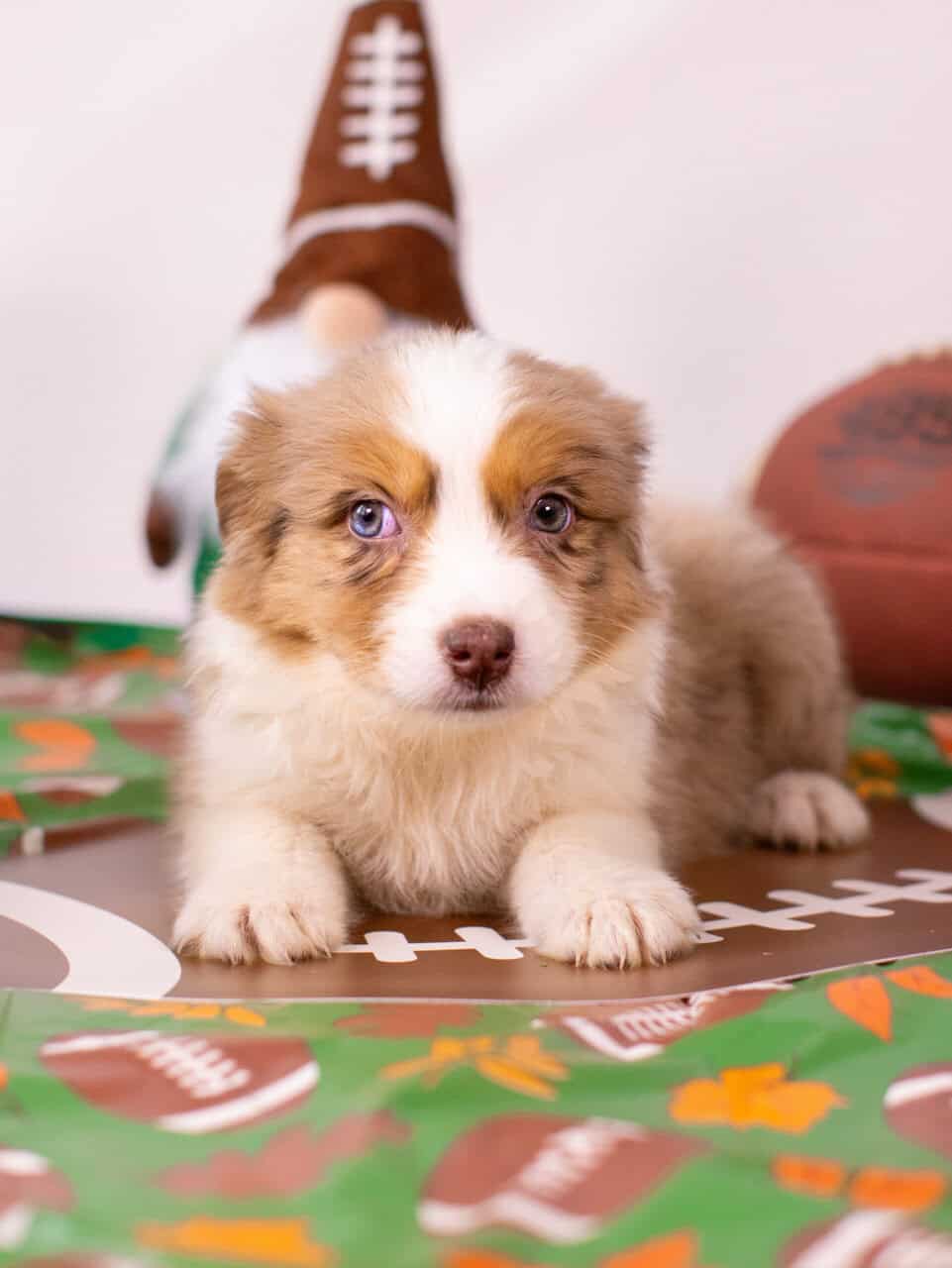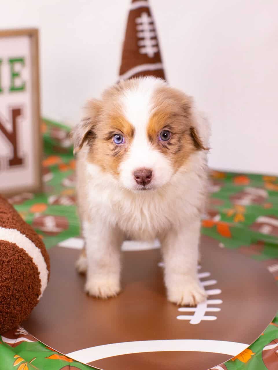 Estimated maturity size 40-50 lbs. She has rich red merle markings. She is up to date on vaccinations and deworming, has started with early socialization, and is AKC eligible.