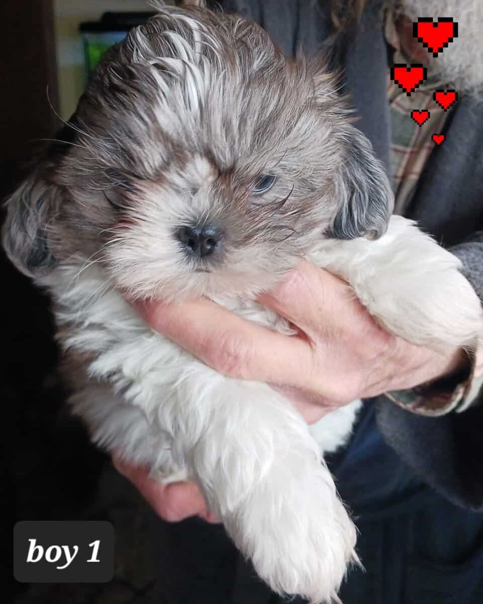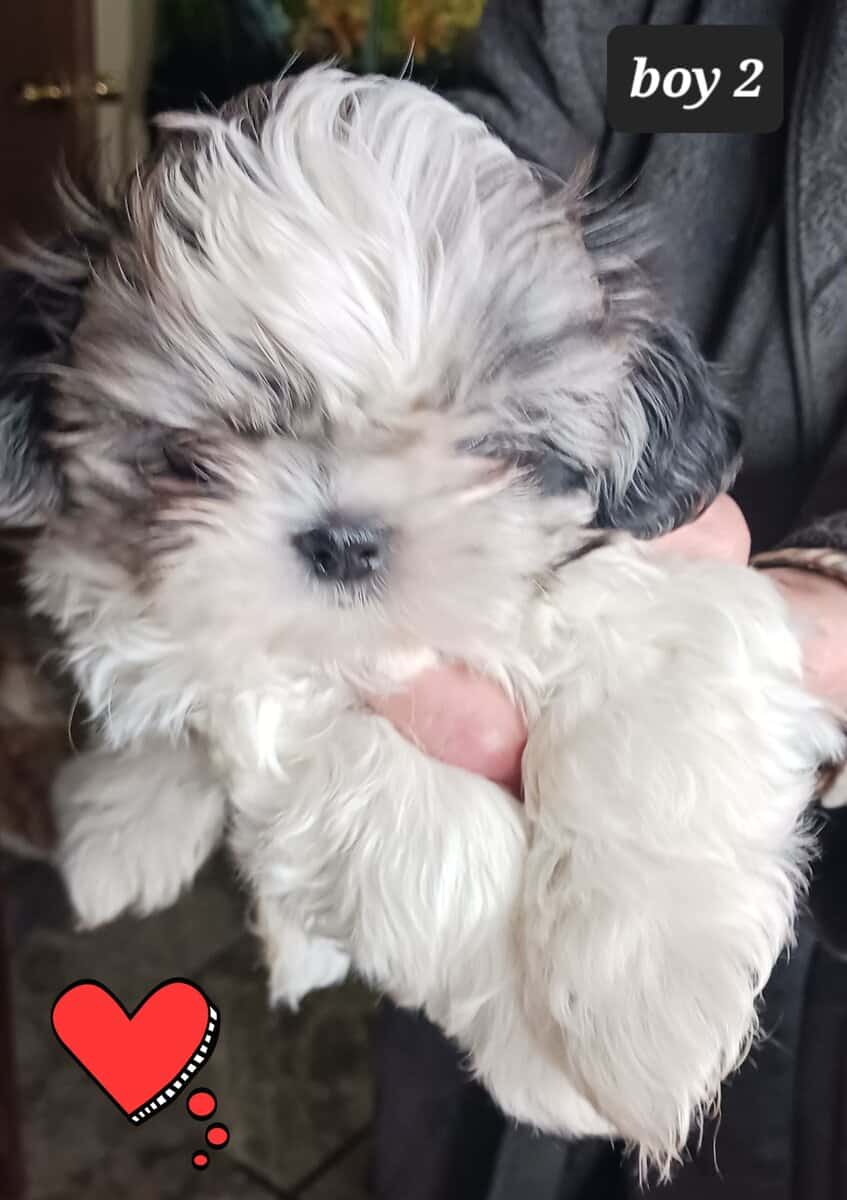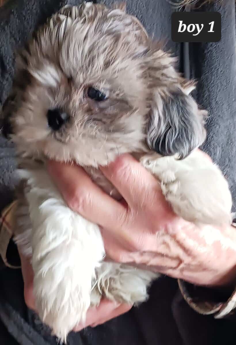 JAZ BOY 1 Sweet, adorable Shih-Tzu boy. He is Blue Merle and white. Has usual markings. Stripe on head instead of full white crown. Shih-Tzu’s are naturally hypo allergenic because they have hair not fur. Mom is a sweet lil lady that loves to be with people all the time. Same with dad, they are both snuggle butts. Mom is about 8 lbs and a Blue Merle. Dad is around 10lbs and red n white. Both parents have sweet and playful temperaments. Baby will have his first set of puppy shots and checked by a licensed vet . I am located in Orland Park IL. If in the area you can stop by to see him in person. He is way cuter in person. He should be ready to train new family around 2-13-26. Asking 950.00 - cash or Zelle only. I am taking deposits now. 708-288-3986. Please text me for better pics or more information. It is easier than trying to log in on my very old and slow computer.