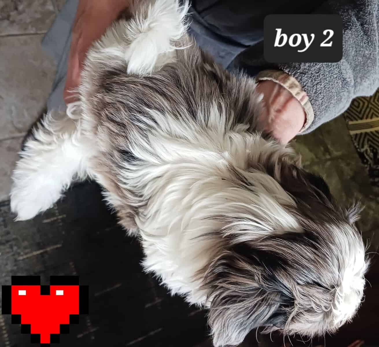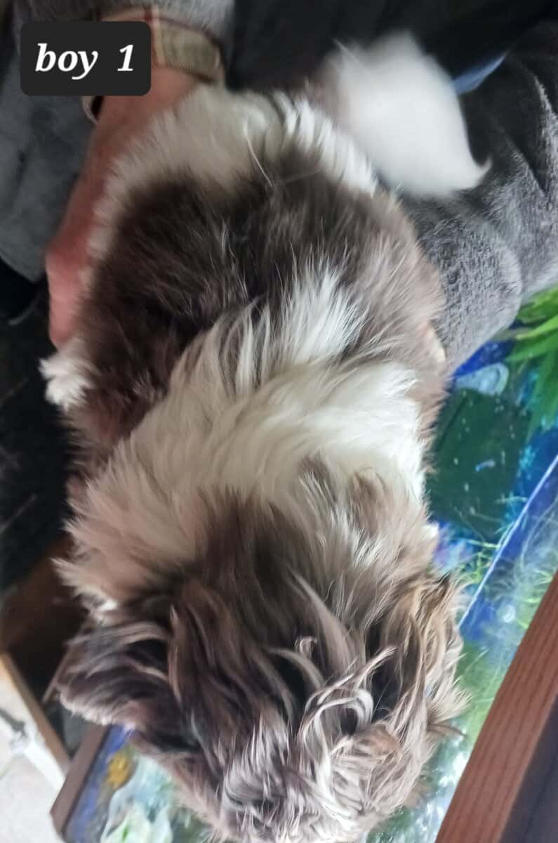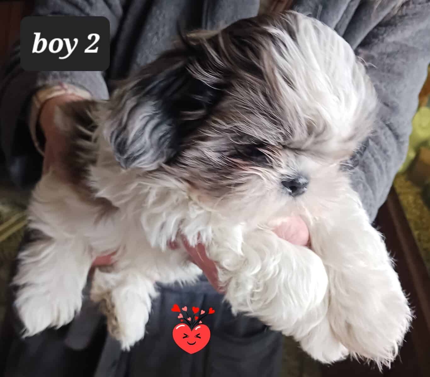 JAZ BOY 1 Sweet, adorable Shih-Tzu boy. He is Blue Merle and white. Has usual markings. Stripe on head instead of full white crown. Shih-Tzu’s are naturally hypo allergenic because they have hair not fur. Mom is a sweet lil lady that loves to be with people all the time. Same with dad, they are both snuggle butts. Mom is about 8 lbs and a Blue Merle. Dad is around 10lbs and red n white. Both parents have sweet and playful temperaments. Baby will have his first set of puppy shots and checked by a licensed vet . I am located in Orland Park IL. If in the area you can stop by to see him in person. He is way cuter in person. He should be ready to train new family around 2-13-26. Asking 950.00 - cash or Zelle only. I am taking deposits now. 708-288-3986. Please text me for better pics or more information. It is easier than trying to log in on my very old and slow computer.