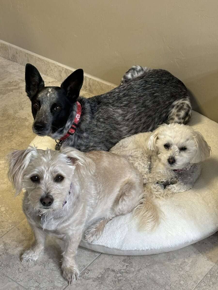 Bella is a shy girl at first, but will come around quickly. Loves belly rubs and will fall asleep next to you while having her ears stroked. She typically sleeps on a dog bed on the floor next to the bed, but sometimes will jump up and lay against you. If you don’t like this, a simple nudge will send her back to the floor. Eventually she’ll stop. She’s a smart cookie. And, if you don’t mind this behavior, she’s a good snuggle buddy and might ask to be covered up.