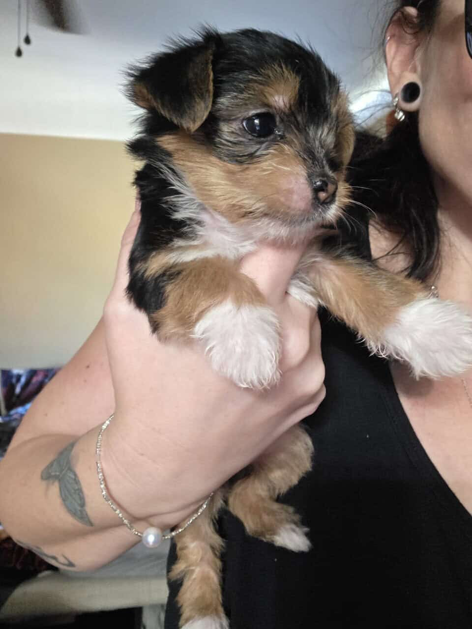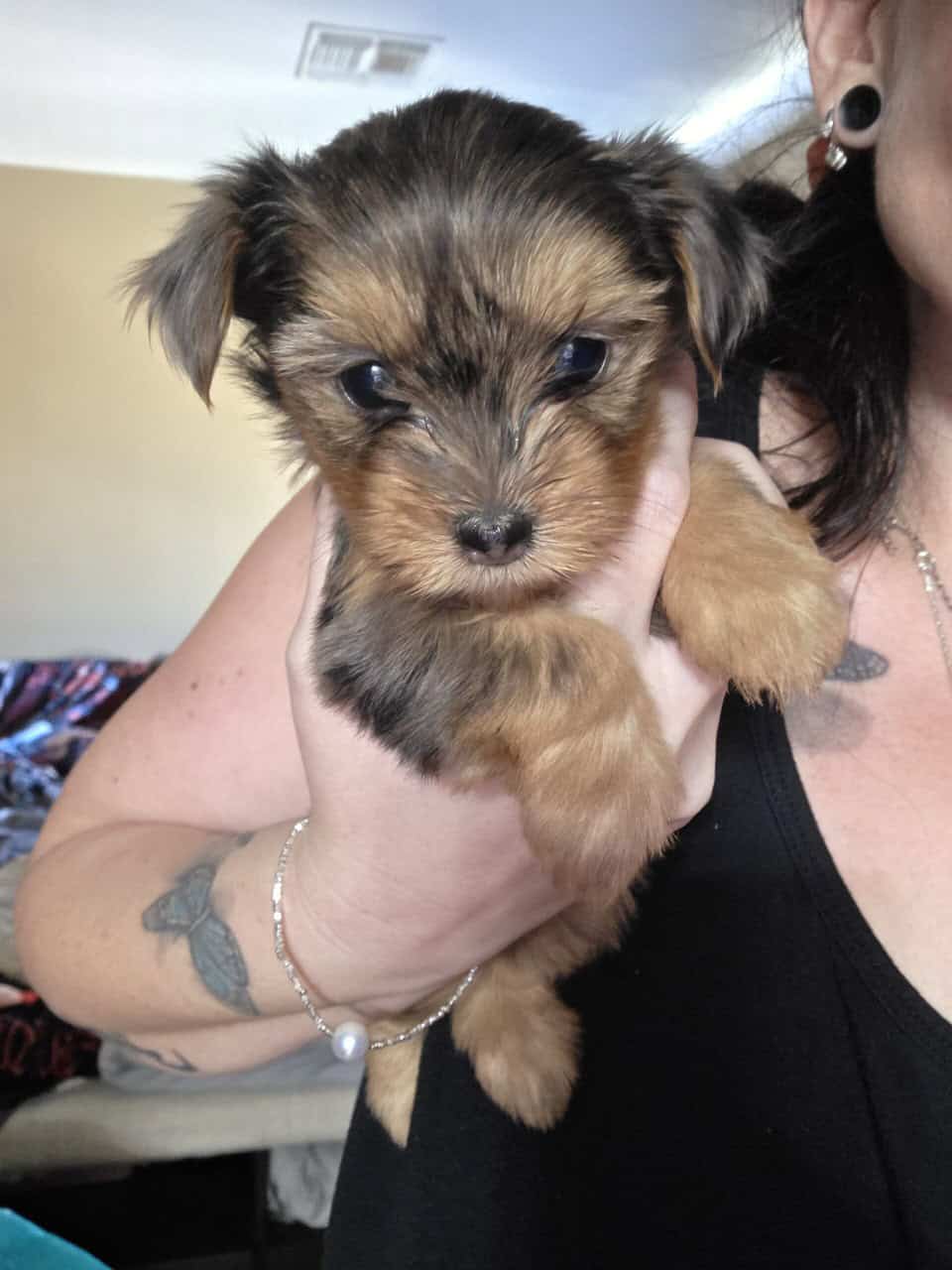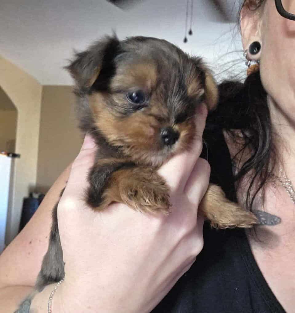 Mom is a traditional blavk and tan @ 7 lbs, Dad is a blue merle with blue eyes @ 4lbs