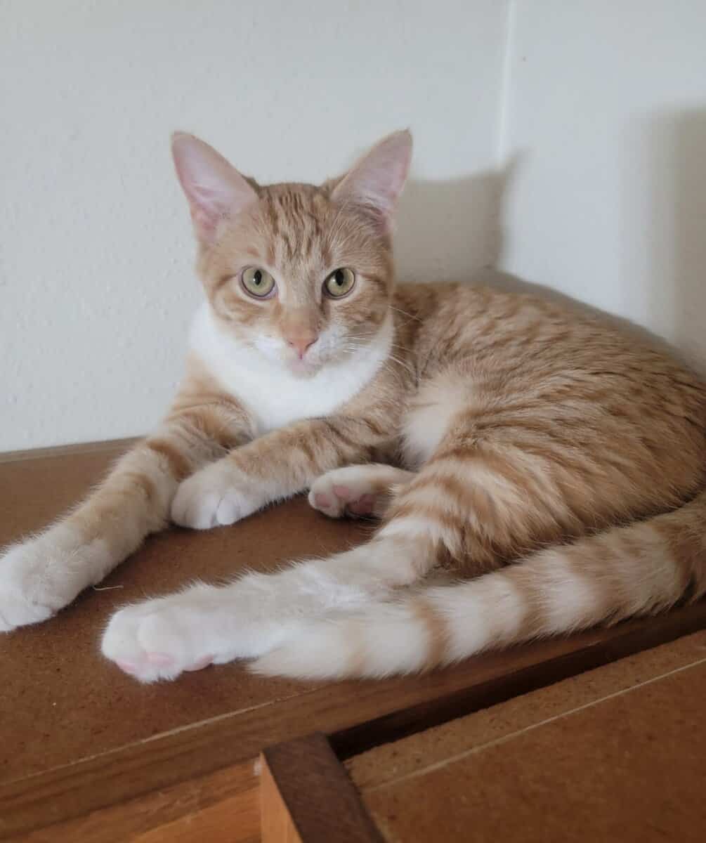 Kitten who never ended up leaving the nest. 9 month old orange and white male cat looking for a good home. He is litterbox trained, fixed, and vaccinated. A playful kitten, he likes to lay on his back and wriggle close to you. Free to a good home, litterbox included.